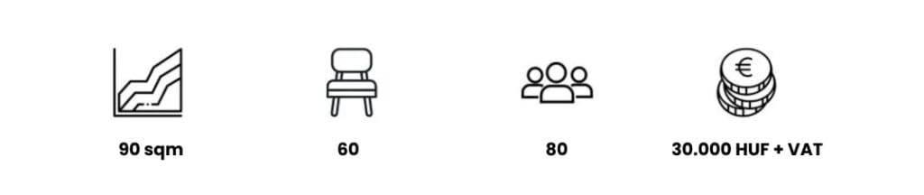For each space renting, we are providing the followings free of charge. All our spaces are unique, so they can suit any need. Check our extra services listed at the More info section for each space. You can visualize the space with our photos and the help of our pictograms regarding how big is the space, how many people can fit seated and standing and what is the hourly rate. Please note that outside working hours there is an extra fee to provide suitable assistance.